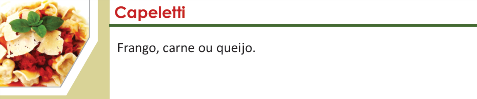 Capeletti, com apresentação de recheios variados, fica a critério do cliente o preparo com molho: à bolonhesa, ao sugo, branco ou 4 queijos.