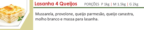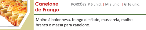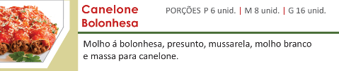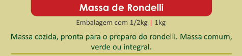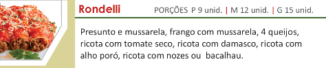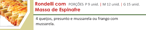 Rondelli, com apresentação de recheios variados, tradicionalmente servido com molho branco, mas fica a critério do cliente o preparo com outro molho (ao sugo, ou 4 queijos).