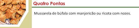 Quatro Pontas, com apresentação de recheios variados, é tradiconalmente servido com molho ao sugo, mas fica a critério do cliente o preparo com outro molho.