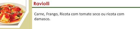 Raviolli, com apresentação de recheios variados, fica a critério do cliente o preparo com molho: à bolonhesa, ao sugo, branco ou 4 queijos.